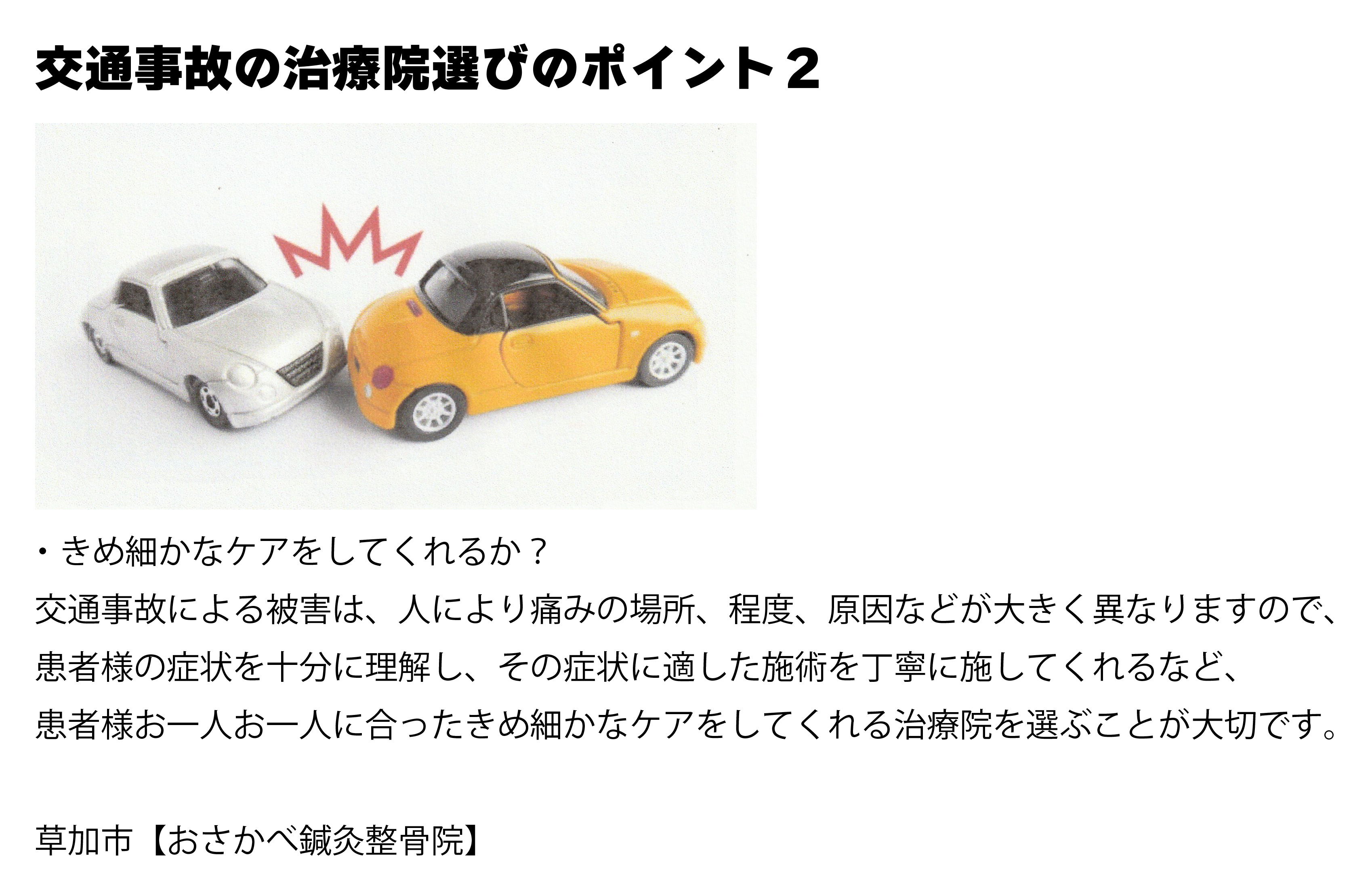 草加市近隣の交通事故治療・むち打ち症治療は、草加市おさかべ鍼灸整骨院にお任せ下さい。